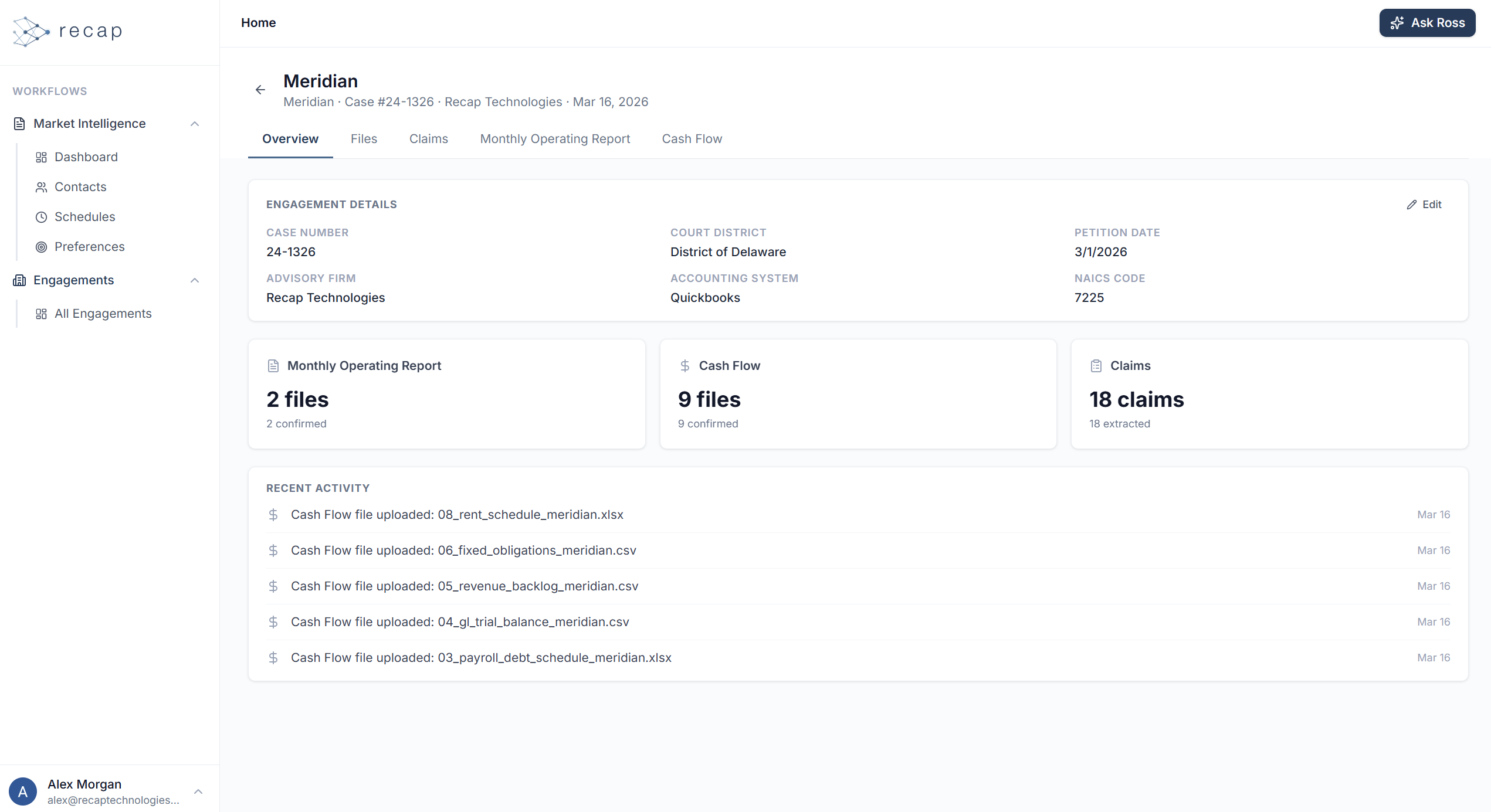 Recap was founded by restructuring professionals who spent a decade in the field — building 13-week cash flow models at 2am, managing claims across creditor classes, staffing cases through cycle surges, and watching institutional knowledge walk out the door with every departure.